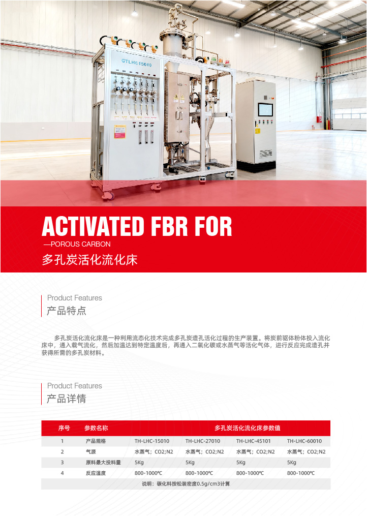 FBR for porous carbon is the production system for the process of pore-forming of the carbon materials by fluidization technology. Carbon precursor powders are feeded into the reactor and fluidized by the carrier gas. And the activating gases, such as carbon dioxide or water vapor, are feeded into the reactor when the reactor is heated to the certain temperature. Then the pore-forming reaction would carry through and the specific porous carbon would be obtained.